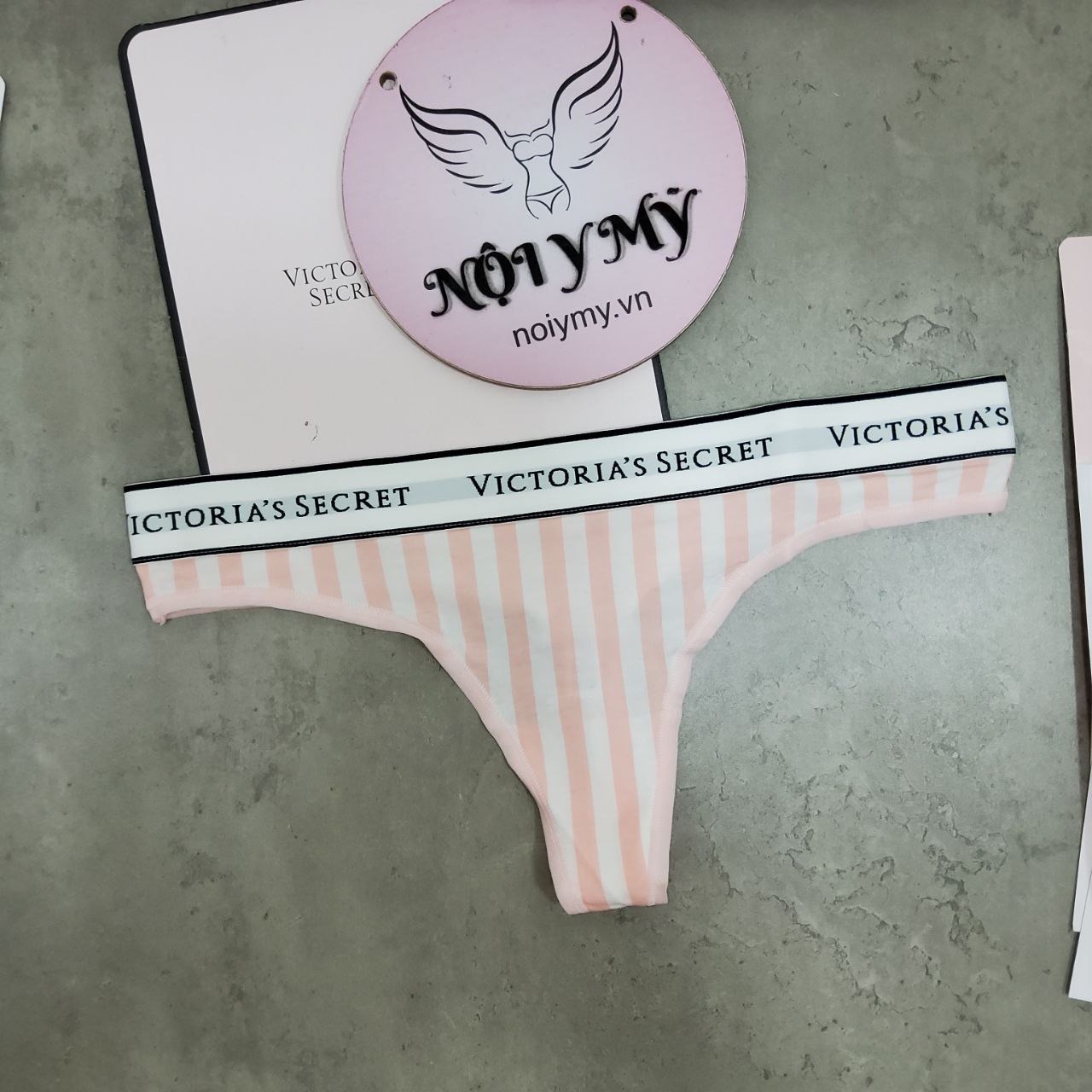 Quần lót Victoria Secret lọt khe thun cotton lưng logo màu hồng sọc trắng 415830spu