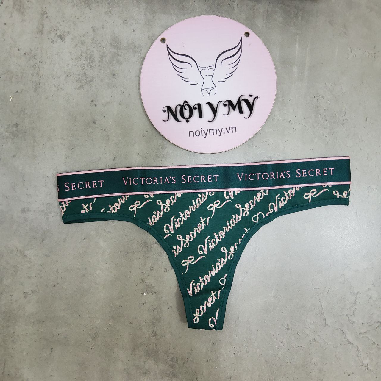 Quần lót Victoria Secret lọt khe thun cotton lưng logo màu xanh lá hoạ tiết 415918qjp